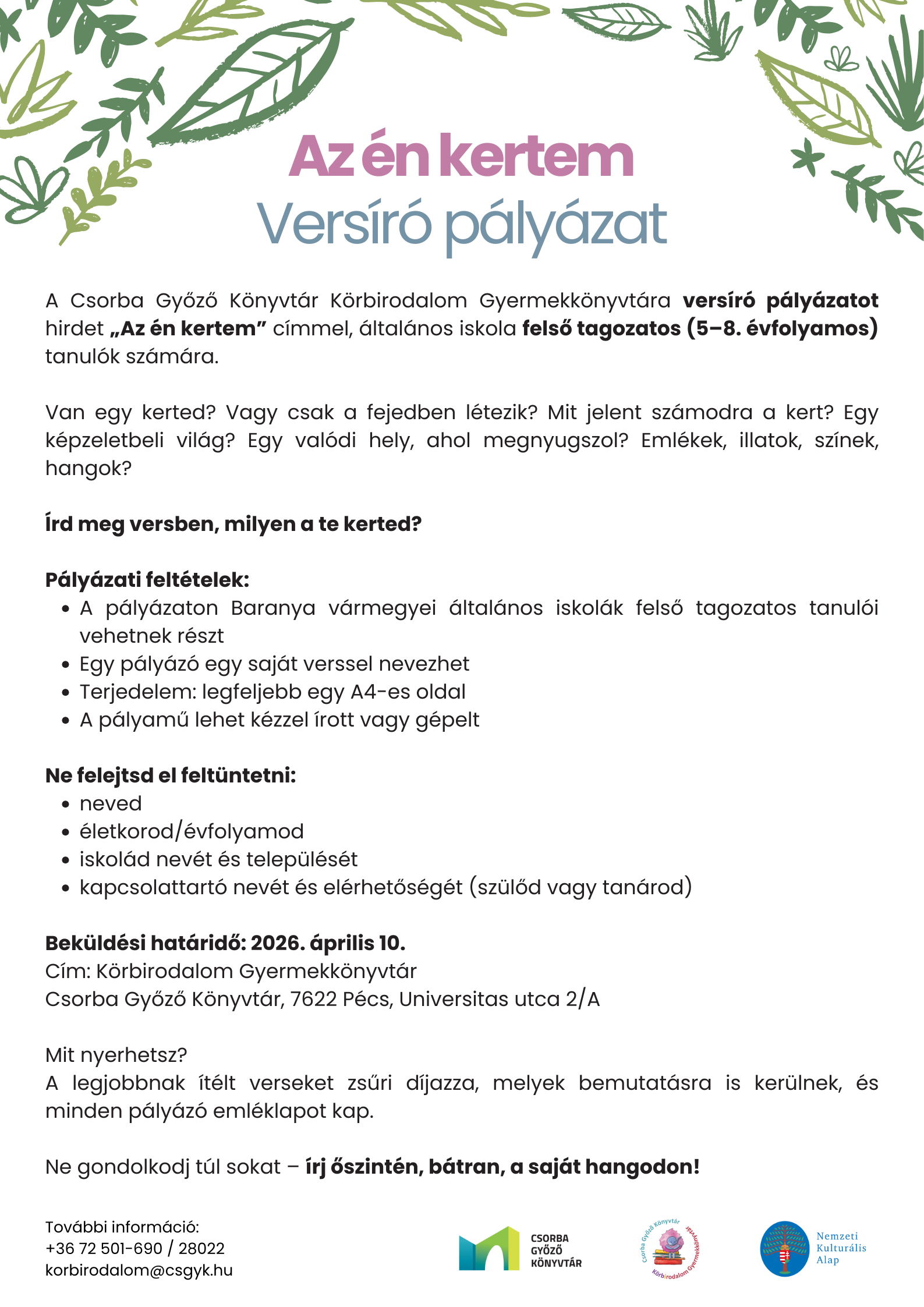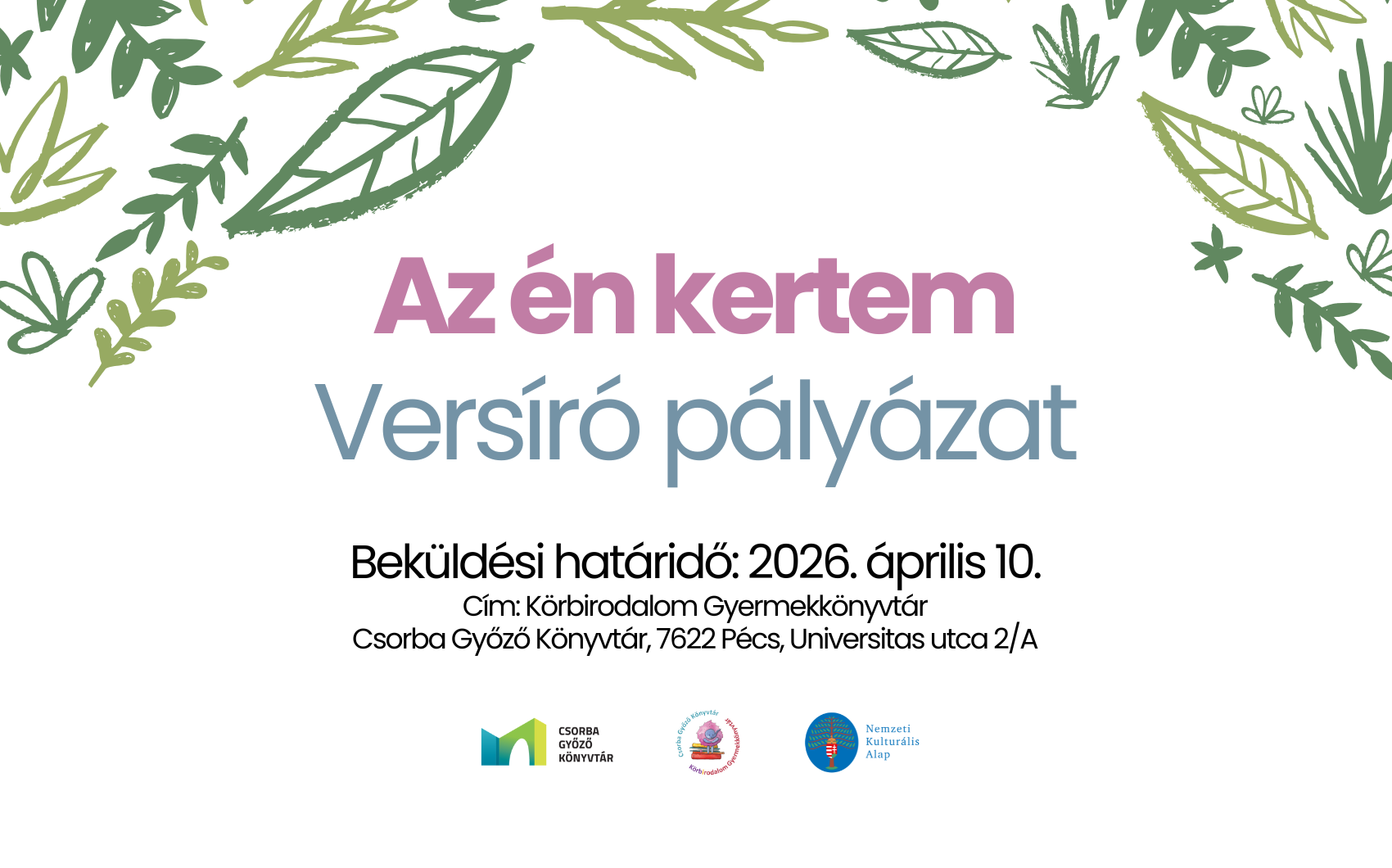 A Csorba Győző Könyvtár Körbirodalom Gyermekkönyvtára versíró pályázatot hirdet „Az én kertem” címmel, általános iskola felső tagozatos (5–8. évfolyamos) tanulók számára.