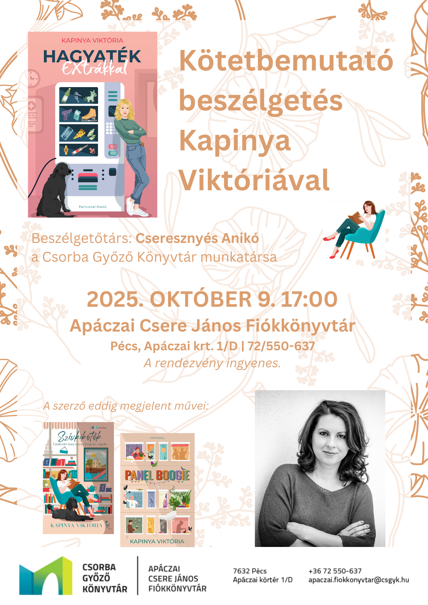A rendezvényen kép-és hangfelvétel készül. A rendezvényen történő részvétellel Ön hozzájárul ahhoz, hogy a Csorba Győző Könyvtár azokat esetlegesen honlapján, illetőleg az esemény Facebook oldalán közzé tegye. A Könyvtár részletes adatkezelési irányelveiről a www.csgyk.hu/dokumentumtar linken tájékozódhat.