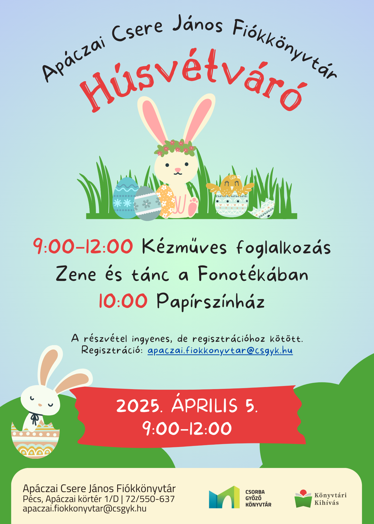 Szeretettel várunk minden érdeklődőt Húsvétváró szombatunkra az Apáczai Csere János Fiókkönyvtárban.