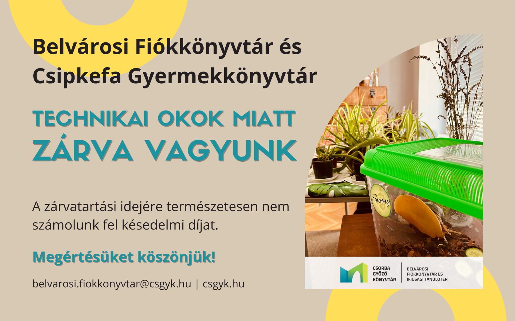 Tájékoztatjuk kedves Olvasóinkat, hogy a Belvárosi Fiókkönyvtár és Csipkefa Gyermekkönyvtár - technikai okok miatt - október 8-tól zárva tart.
