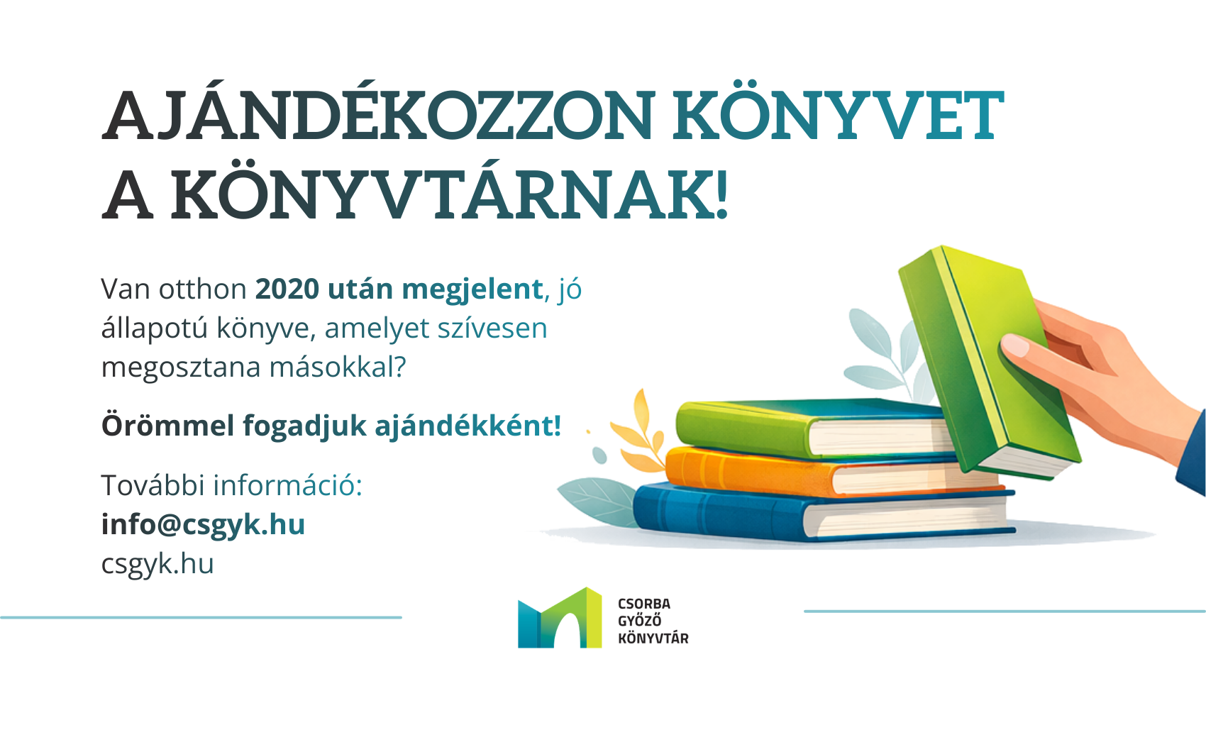 A Csorba Győző Könyvtár közösségi könyv gyarapítási kezdeményezést indít. Ha van otthon 2020 után megjelent, jó állapotú könyve, amelyet szívesen megosztana másokkal, örömmel fogadjuk ajándékként.