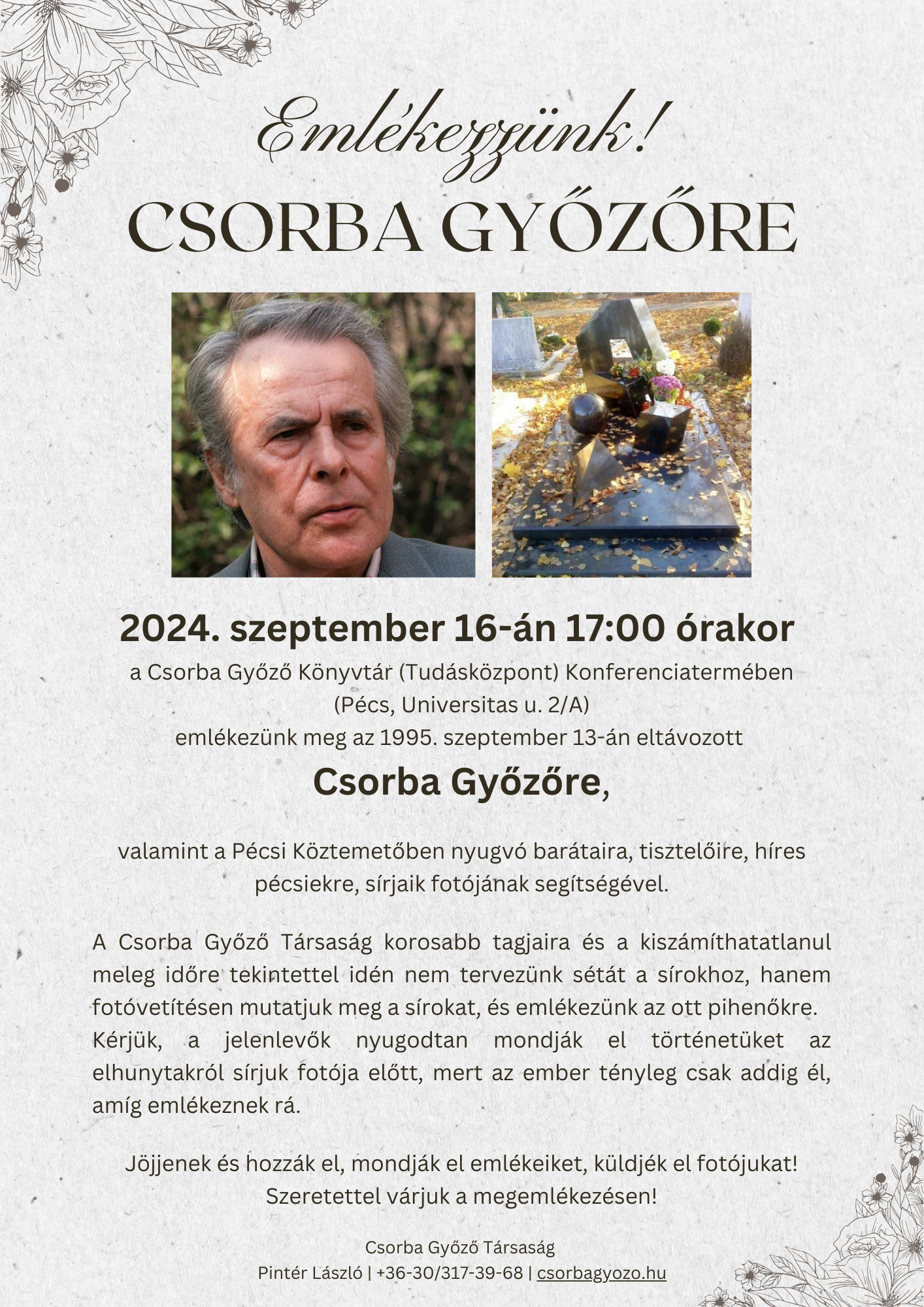 Emlékezzünk! 2024. szeptember 16-án 17 órakor a Csorba Győző Könyvtár (Tudásközpont) Konferenciateremében az 1995. szeptember 13-án eltávozott Csorba Győzőre, valamint a Pécsi Köztemetőben nyugvó barátaira, tisztelőire, híres pécsiekre, sírjaik fotójának segítségével.