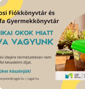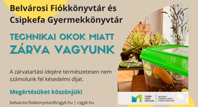 Tájékoztatjuk kedves Olvasóinkat, hogy a Belvárosi Fiókkönyvtár és Csipkefa Gyermekkönyvtár - technikai okok miatt - október 8-tól zárva tart.