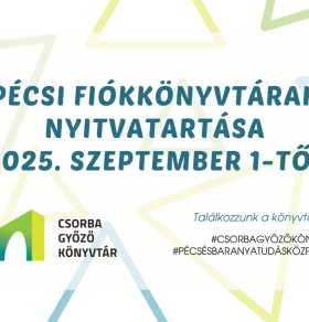 Kedves Olvasóink! Pécsi fiókkönyvtáraink nyitvatartása 2025. szeptember 1-től megváltozik. Találkozzunk a könyvtárban!