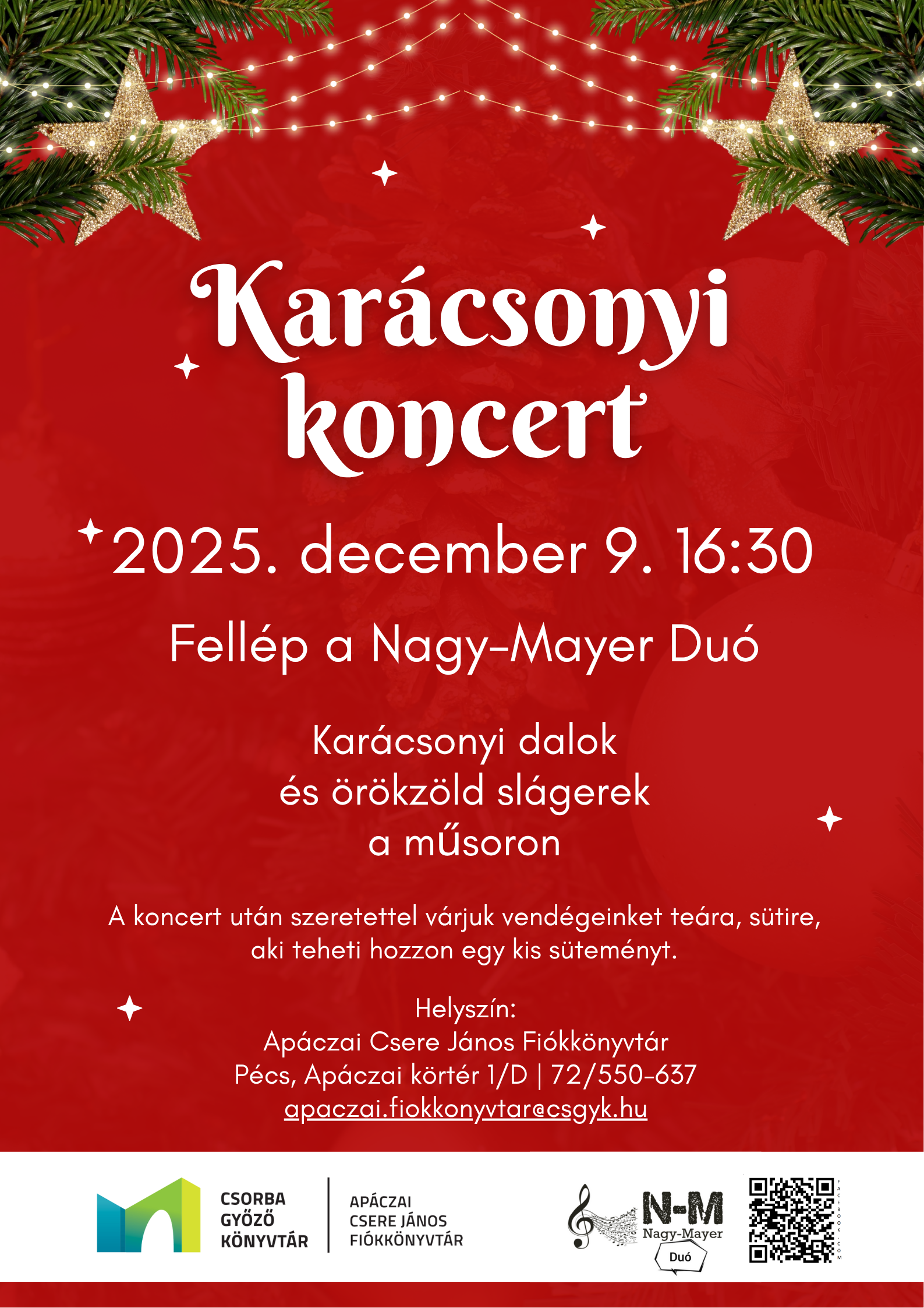 Szeretettel várunk minden érdeklődőt 2025. december 9-én az Apáczai Csere János Fiókkönyvtárban, ahol karácsonyi dalok és örökzöld slágerek csendülnek fel a Nagy-Mayer Duó előadásában.
