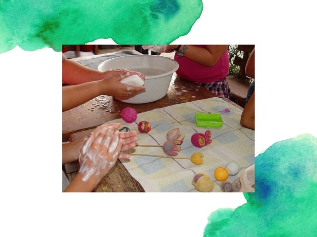Vakáció, vizes játékok készítése: nemezelés, csuhézás. Anyagai: csuhé, rafia, szalma, gyapjú.