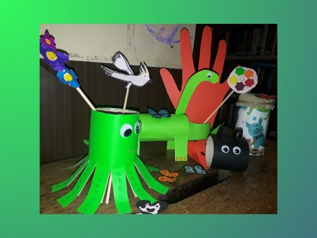 Kézügyességet, koncentrációt, kreativitást fejlesztő játék, aminek csak a fantáziánk szab határt, esetleg az olló. Ezen a zöld-kézműves foglalkozáson mindenféle háztartási hulladékból készítünk lényeket, tárgyakat, együtt alkottunk a gyerekekkel. Figurákat, állatokat, karácsonykor Mikulást, angyalt, krampuszt, hangszert: csörgőt, stb.